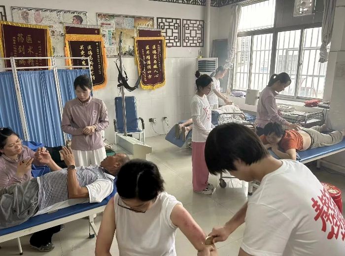 实践团成员在第二附属医院老师们的带领下,携带器材前往山南镇卫生院开展中医护理技术义诊活动,帮助村民解决常见慢性病的困扰,并根据具体情况给出日常生活保健建议。活动现场,前来就诊的患者络绎不绝,老师和同学们有条不紊地为老人们开展艾灸、拔罐、火龙罐、刮痧、耳穴压豆等治疗。