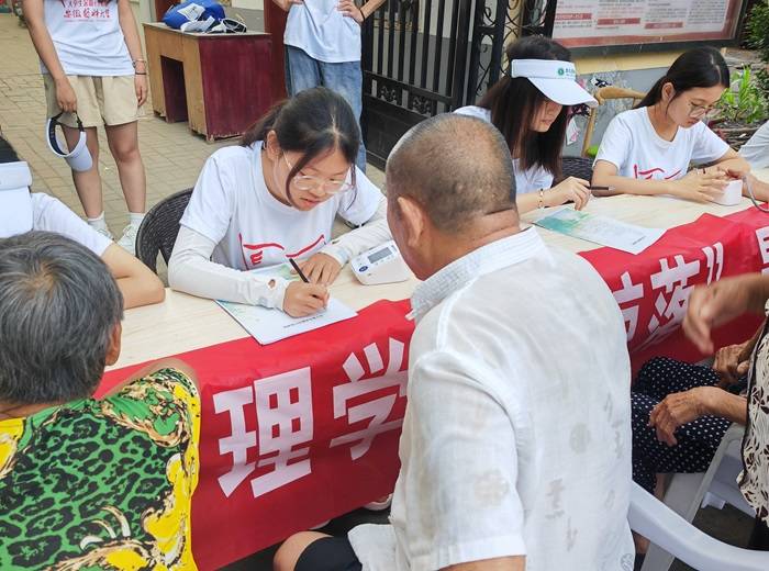 深入邻里服务站,开展健康咨询。在指导老师的带领下,实践队成员们在濉溪县红心党群邻里服务站开展了一场以“健康义诊社区行,真情服务暖人心”为主题的健康咨询活动。活动中,实践队员结合自身专业知识,为当地居民测量血压、讲解常见疾病知识和用药注意事项等,进一步提升村民健康意识,普及健康生活方式。